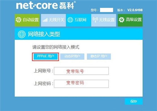 PPPoE用户指的是:宽带运营商提供了 宽带账号、宽带密码给你,在未使用路由器的时候,电脑上需要用“宽带连接”(或者类似的拨号程序),填写宽带账号、密码进行拨号上网。那么此时,“网络接入类型”就应该选择:PPPoE用户——>“上网账号”填写宽带运营商提供的:宽带账号——>“上网密码”填写宽带运营商提供的:宽带密码。
