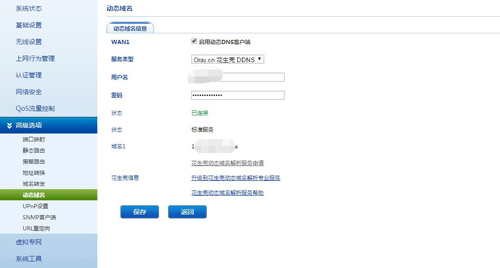 5、绑定花生壳动态域名(前提是已注册好花生壳,购买了动态域名,免费域名也可以),使用域名替代动态出口IP访问内网服务器