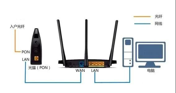 将光猫和无线路由器通电后,使用网线将光猫LAN口连接到路由器WAN口,然后再找根网线将电脑与路由器的任意一个LAN口连接起来。