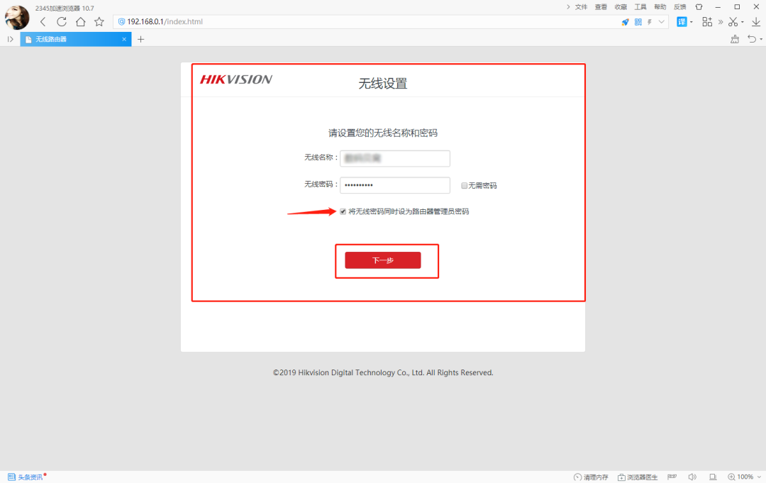 5.输入“无线名称”和“无线密码”,点击“下一步”。