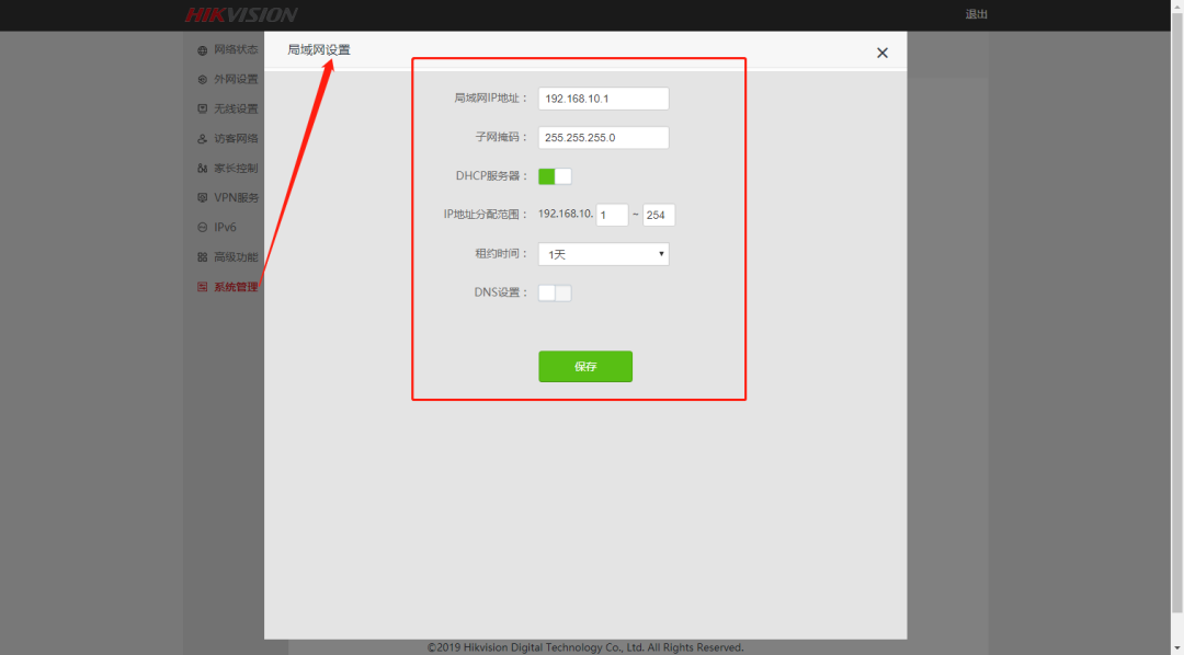8.建议点击“系统管理”,将“局域网设置”——“局域网IP地址”修改192.168.10.1,点击“保存”,等待路由器自动重启,输入新的路由器网关地址“192.168.10.1”,登入路由器。
