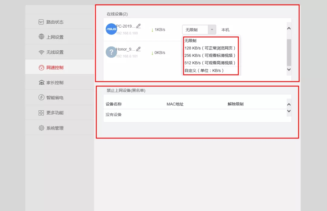 “网速控制”界面,可以对设备进行网速限制和“禁止上网”限制