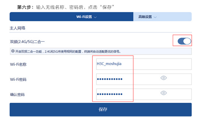 第六步:输入无线名称、密码后,点击保存