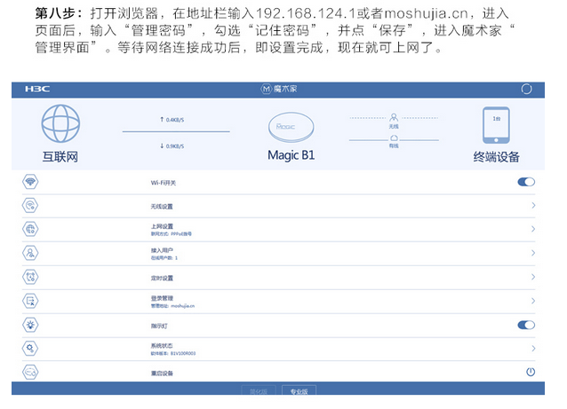 第八步:打开浏览器,在地址输入192.168.124.1或者moshujia.cn,进入页面后,输入管理密码,勾选记住密码,并保存,进入魔术家管理界面,等待网络连接成功,即可设置,现在可以上网了。