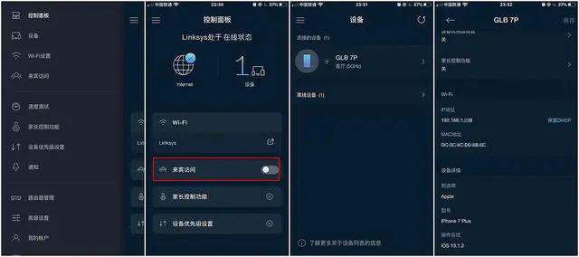 整体app管理上看上去非常清爽的。主管理页面可以很清爽的查看当前网络状态、链接设备、WiFi信息分享、访客网络设置、家长控制和设备优先级设置都可以在第一页查看并且设置。