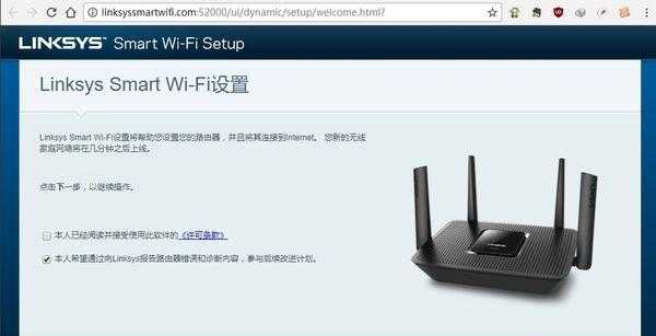 ▼为测试EA8300设置便利性,特意将EA8300的WAN口接在已pppoe拨号的UBNTER-XLAN口处,采用自动设置(在进行后续测试时采用pppoe拨号)。电脑端搜索EA8300背面的账号、密码,浏览器端输入“192.168.1.1”进入如下页面。勾上“本人已阅读XXX”,点击下一步。