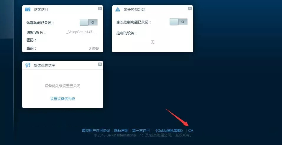 Velop除了用电脑进行WEB设置,还可以进入更高级的设置选项,需要在WEB界面下方,点击“CA”,如下图:(双频版和三频版都可以)