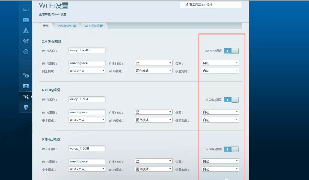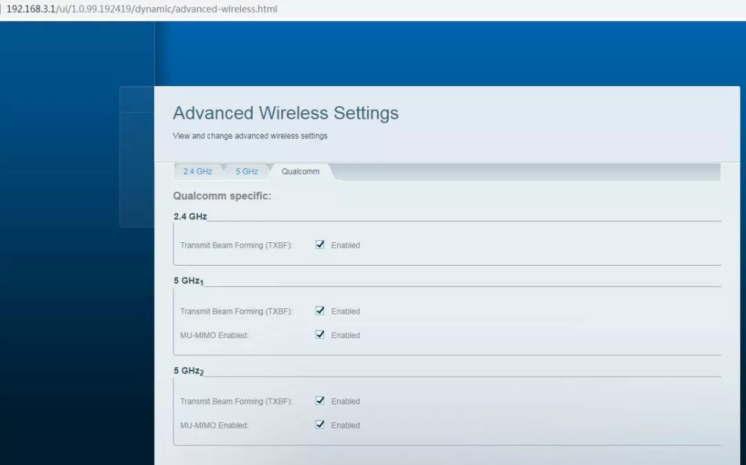 然后还有个更高级的无线设置,修改一下地址栏就行,例如你登录了WEB设置页,地址是http://192.168.3.1/ui/1.0.99.192419/dynamic/home.html,192.168.3.1是我设置Velop的IP地址,那么复制这一串“advanced-wireless.html”代替“home.html”就行,替换后的地址是:http://192.168.3.1/ui/1.0.99.192419/dynamic/advanced-wireless.html