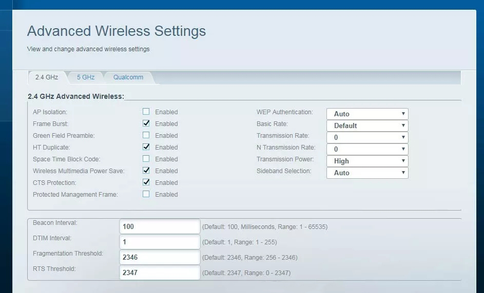 当中有个“Qualcomm”的选项,里面包括了MU-MIMO和波束成形的开关选项: