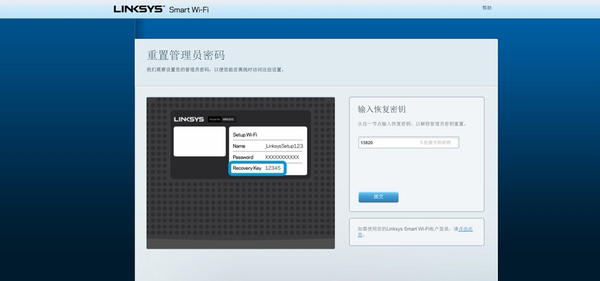 输入路由器底部的恢复密钥,点击提交按钮。