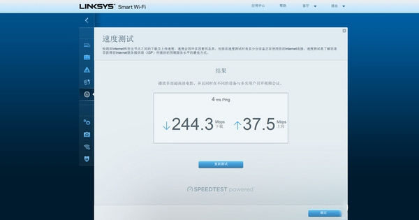 路由器的网速测试功能,测试我家的网络带宽下载速度为244.3Mbps,上传速度为37.5Mbps。
