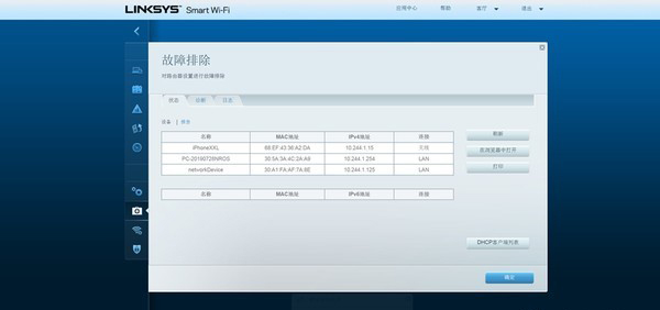 故障排除的状态中可以查看各个网络终端的状态。