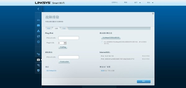 故障排除功能中可以实现PING主机功能,跟踪路由功能,重启Velop功能,恢复出厂设置功能。