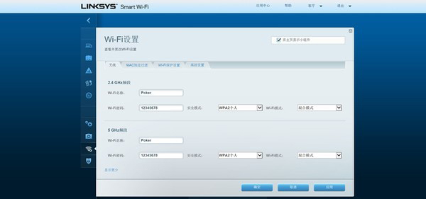 在WIFI设置中,可以实现2.4G+双5G的同一个无线名称,也可以设置不同名称。比如2.4G无线名称为Poker,5G无线名称为Poker1。其中双5G的无线频段是不能再单独设置的。