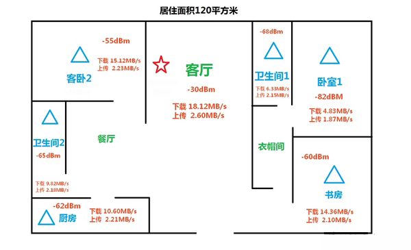 房间示意图中标注了房间的格局和信号的强弱,光纤线缆的出现口就在客厅五角星标记的地方,这里也是摆放沙发的地方,我的光猫和无线路由器都是放在沙发下面。客厅摆放无线路由器的位置也是整个房间中最居中的位置,所以无线信号的覆盖理论上会更加的平均一些。在图中可以看到卫生间1和客厅之间是一道承重墙,因为内部钢筋比较密集所以信号衰减的很厉害,下载速度有明显的降低,而卫生间1与卧室1之间是另一道承重墙,信号衰减的就更厉害了,下载速度只有4MB/s左右了,其实这个速度看视频玩游戏也是够用了,之前用的TPLink6天线的路由器在卧室1中下载速度基本只有300-400KB/s,有时候干脆就没信号,所以我的主卧室的无线信号问题让人十分头疼,必须上高端产品才能解决。