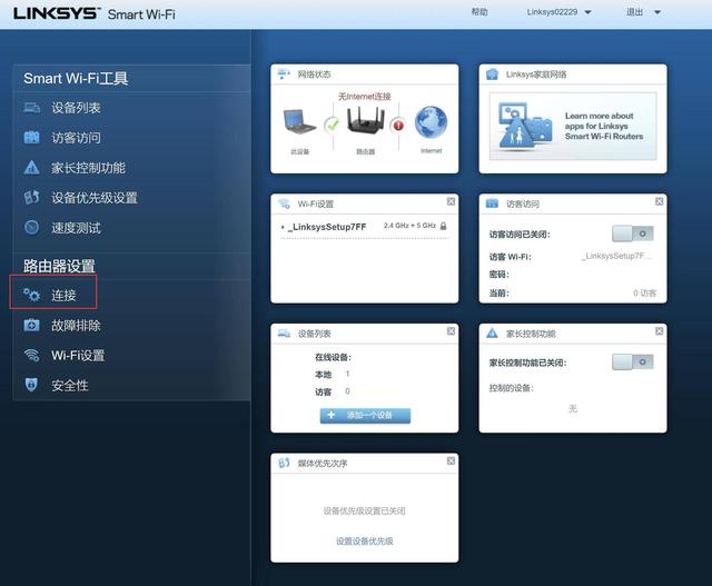 终于,别的路由器一步就能进入的页面,咱们需要N个步骤能过来……可以看到由于网页端并没有引导,外网连接是不存在的,只能自己动手丰衣足食,此时点击上图红框中的“连接”。
