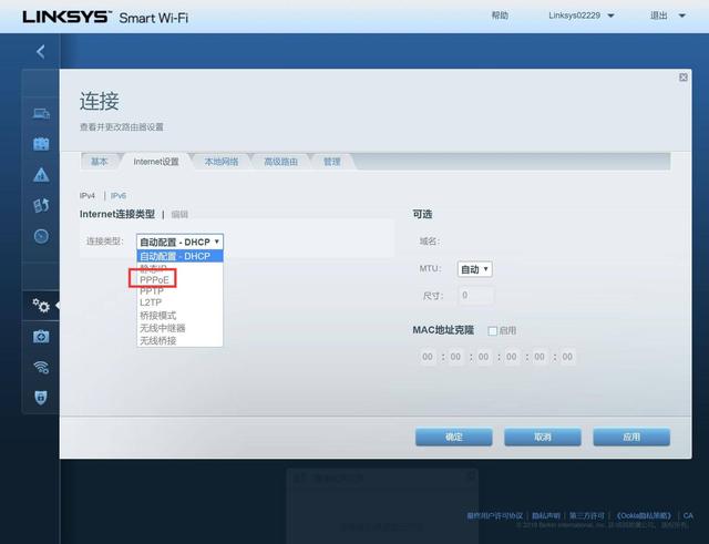 此时就需要根据你家里的上网方式选择连接类型,我家里是PPPoE(大多数电信用户的选择),选它即可。这里因人而异,不清楚就打电话问运营商或者帮你家装网的工作人员。