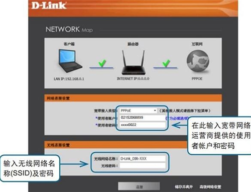 这时候在设置DIR629路由器上网时,“宽带连接类型”就应该选择:PPPoE——>然后填写宽带运营商提供的宽带账号、宽带密码——>自定义设置“无线网络名称”、“无线密码”——>点击“连接”。
