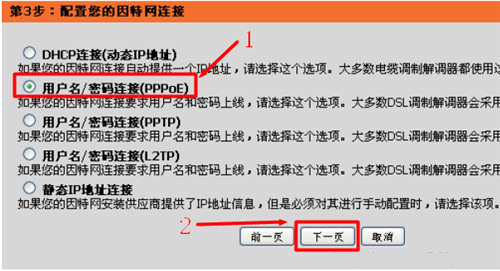 9、选择“用户名/密码连接(PPPoE)”——>点击“下一页”。