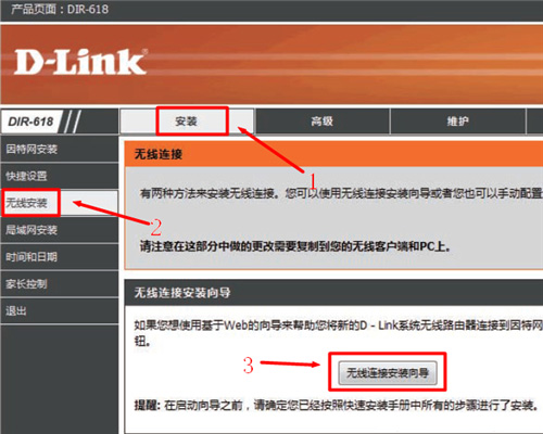 14、点击“安装”——>“无线安装”——>“无线连接安装向导”。