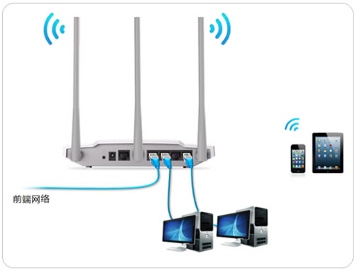 按照应用拓扑图将MW456R的任意LAN口(即1~4号接口)与前端网络接口(或局域网交换机)相连接。需要上网的台式机可以连接任何LAN口上网,无线终端搜索到设置好的无线信号即可上网。