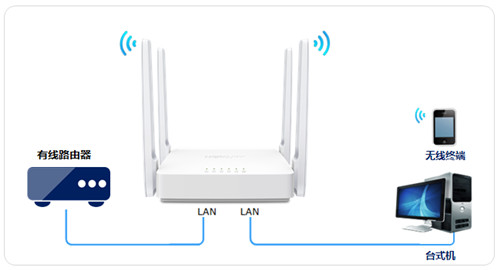 按照下图将MW323R的任意一个LAN口(即1~4号接口)与前端网络接口(或局域网交换机)连接。需要上网的台式机可以连接任何其他LAN口上网,无线终端搜索到设置好的无线信号即可上网。