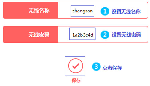 在此处修改 无线名称,建议使用数字、字母的组合,请勿使用中文或特殊字符。设置一个至少8位以上的 无线密码,点击 保存,即设置完成。无线终端可以连接修改后的无线网络。