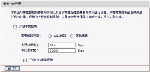 选择ADSL线路,填写上下行总带宽值,ADSL线路上行一般为512Kbps,下行根据实际填写,1M=1000Kbps。先不勾选开启IP带宽控制,点击保存。