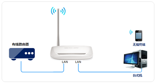 按照应用拓扑图将MW150R的任意LAN口(即1~4号接口)与前端网络接口(或局域网交换机)相连接。需要上网的台式机可以连接任何LAN口上网,无线终端搜索到设置好的无线信号即可上网。