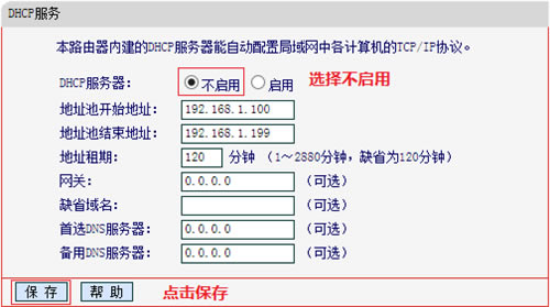 在管理界面左侧点击 DHCP服务器 >> DHCP服务设置,DHCP服务器选择 不启用,点击 保存。