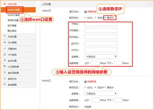 ①如果您是拨号上网用户,联网方式选择“ADSL”,然后输入运营商给您的宽带账号与密码,选择您使用的运营商,在“线路带宽”处填写运营商提供的上行与下行带宽。继续输入您申请的带宽后点击“确定”即可联网;
