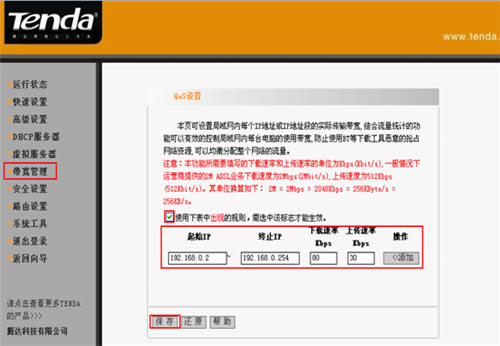 登陆管理界面后,点击“带宽管理”--“启用”--填写“起始IP“和“终止IP”(可以是单个IP,也可以是一个IP段)--填写指定IP范围内的电脑“下载速率”和“上传速率”-“保存”,如下图所示: