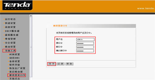 2、登陆管理界面后,点击“系统工具”--“修改登录密码”,路由器的原始密码是“admin”,您可以输入新的用户名和口令,修改后点击“保存”。所下图所示: