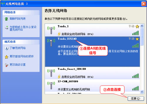 6、选中名为Tenda_XXXXXX的无线网络(X为A8背面MAC地址的后六位),点击“连接”