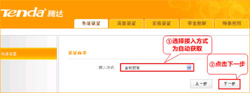 6、选择接入方式“自动获取”点击“下一步”