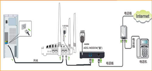 将电话线(比较细的那根线)接猫的line口(比较小的那个口),猫分出来一根网线接路由器的WAN口,再找一根短网线,一头接电脑,一头接路由器1/2/3任意接口,接线方式如下图: