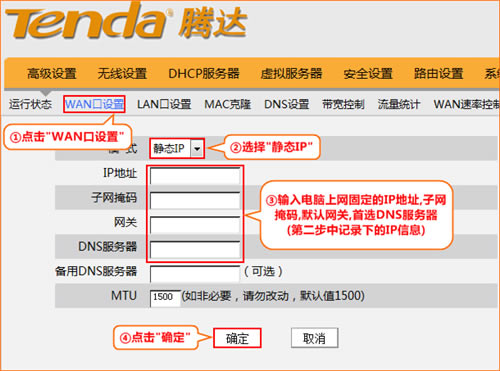 3、点击“WAN口设置”,选择模式为:“静态IP”,输入电脑上网固定的IP地址,子网掩码,默认网关,DNS服务器,“确定”即可