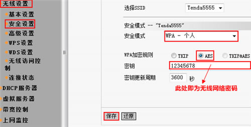 2、在随后的页面中选择“无线设置”-“无线安全” 输入新的无线密码“保存”。