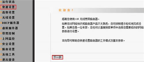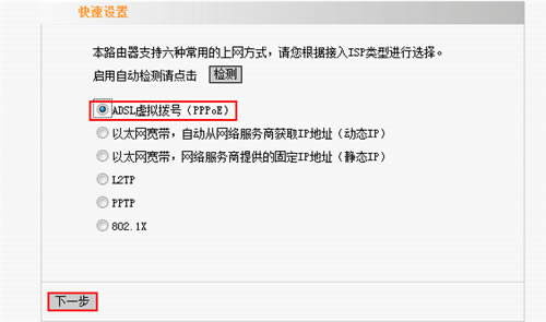 3、在随后的页面中选择上网方式为“ADSL虚拟拨号(ADSL拨号)”点击“下一步”。
