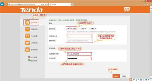 2、点击“上网设置”,选择联网方式为“ADSL拨号”,输入运营商提供的宽带账号及宽带密码,点击“确定”,如下图: