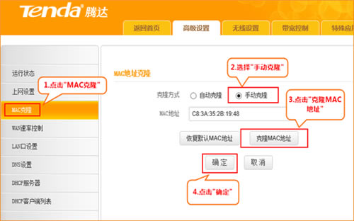 3、点击“MAC克隆”- “手动克隆”- “克隆MAC地址”-“确定”