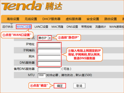 2、在页面中点击“高级设置”-“WAN口设置”,选择模式为:“静态IP”,输入电脑上网固定的IP地址,子网