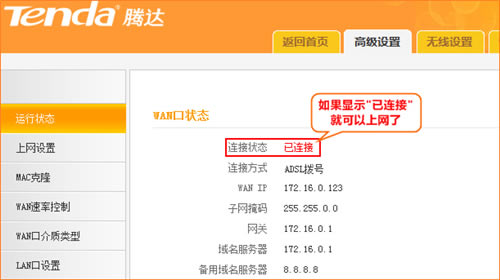如果WAN口状态显示“已连接”,就可以浏览网页,上网冲浪了。