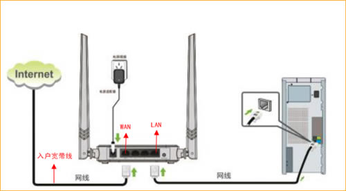 直接将入户的网线(没有猫的用户)或者猫出来的网线(有猫的用户 )接在路由器的WAN口,再找一根短网线,一头接电脑,一头接路由器1/2/3任意接口,接线方式如下图: