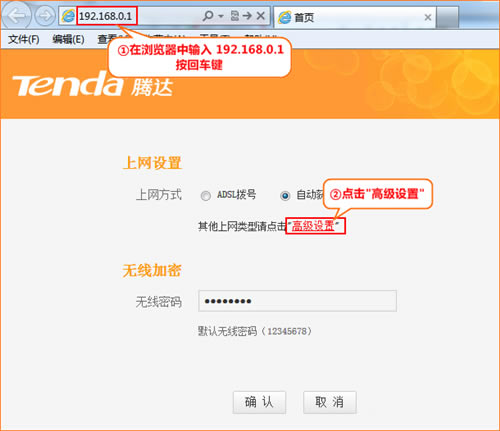 1、在浏览器搜索栏中输入:192.168.0.1 按回车键,在跳转的页面中点击“高级设置”