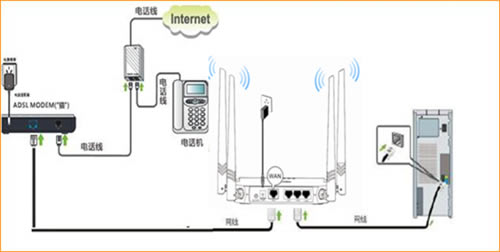 将电话线(比较细的那根线)接“猫”的line口(比较小的那个口),“猫”分出来一根网线接路由器的WAN口,再找一根短网线,一头接电脑,一头接路由器LAN1/LAN2/LAN3任意接口,接线方式如下图: