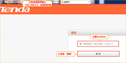 在浏览器搜索栏中输入:192.168.0.1 按回车键,在跳转的页面中输入密码 admin 点击“登录”