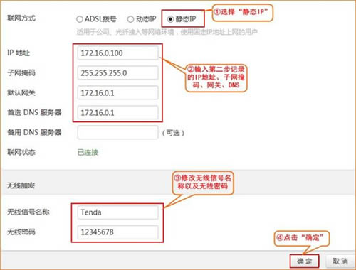 2.在页面中选择“静态IP”,输入电脑上网固定的IP地址,子网掩码,网关,首选DNS服务器,点击“确定”保存 ,参考如下操作步骤: