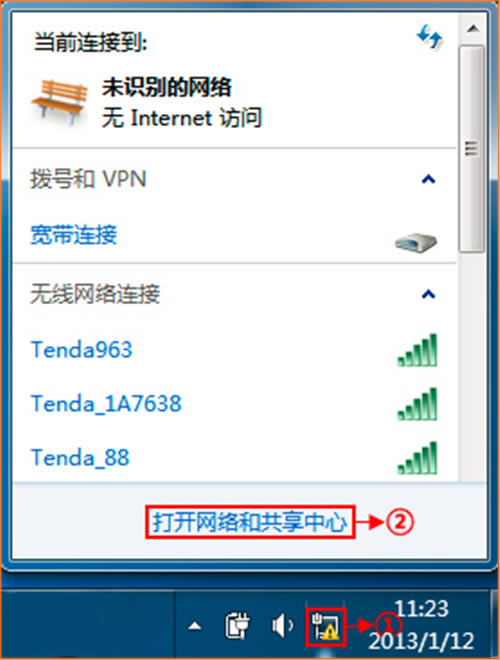 第一步:点击桌面右下角的网络图标,打开“网络和共享中心”