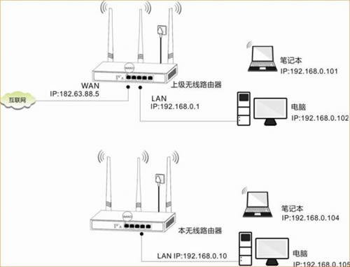 将两台无线路由器的LAN口地址设置为同一网段的不同IP地址,如上级无线路由器的LAN口地址是192.168.0.1,则可设置无线路由器LAN口IP地址为192.168.0.X(3~254);
